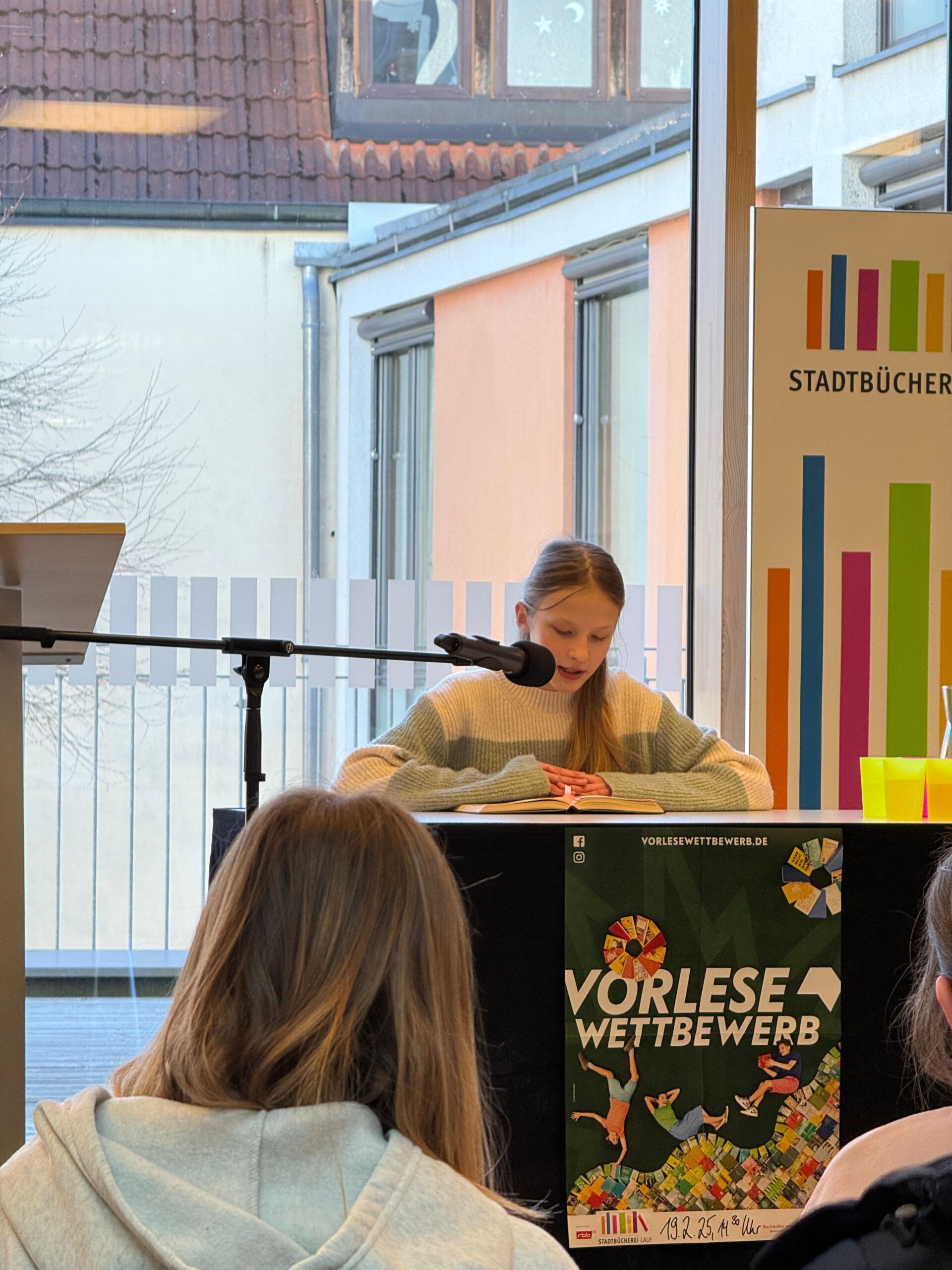 Hier fanden sich begeisterte und vorlesefreudige Sechstklässler/innen ein, um selbst zu lesen oder ihren Mitschüler/innen seelischen Beistand zu geben und Daumen zu drücken. Als Jury waren neben der Fachschaftsleitung Deutsch jeweils ein Mitglied aus dem Elternbeirat, dem Förderverein und der SMV anwesend sowie die Vorjahressiegerin, Nele Weigel, unsere Schulleiterin, Frau Dr. Seutter, und Herr Krist von der Buchhandlung „Lilliput“, der auch dieses Jahr wieder die Buchpreise für alle Vorlesenden mitgebracht hat – Vielen Dank dafür!