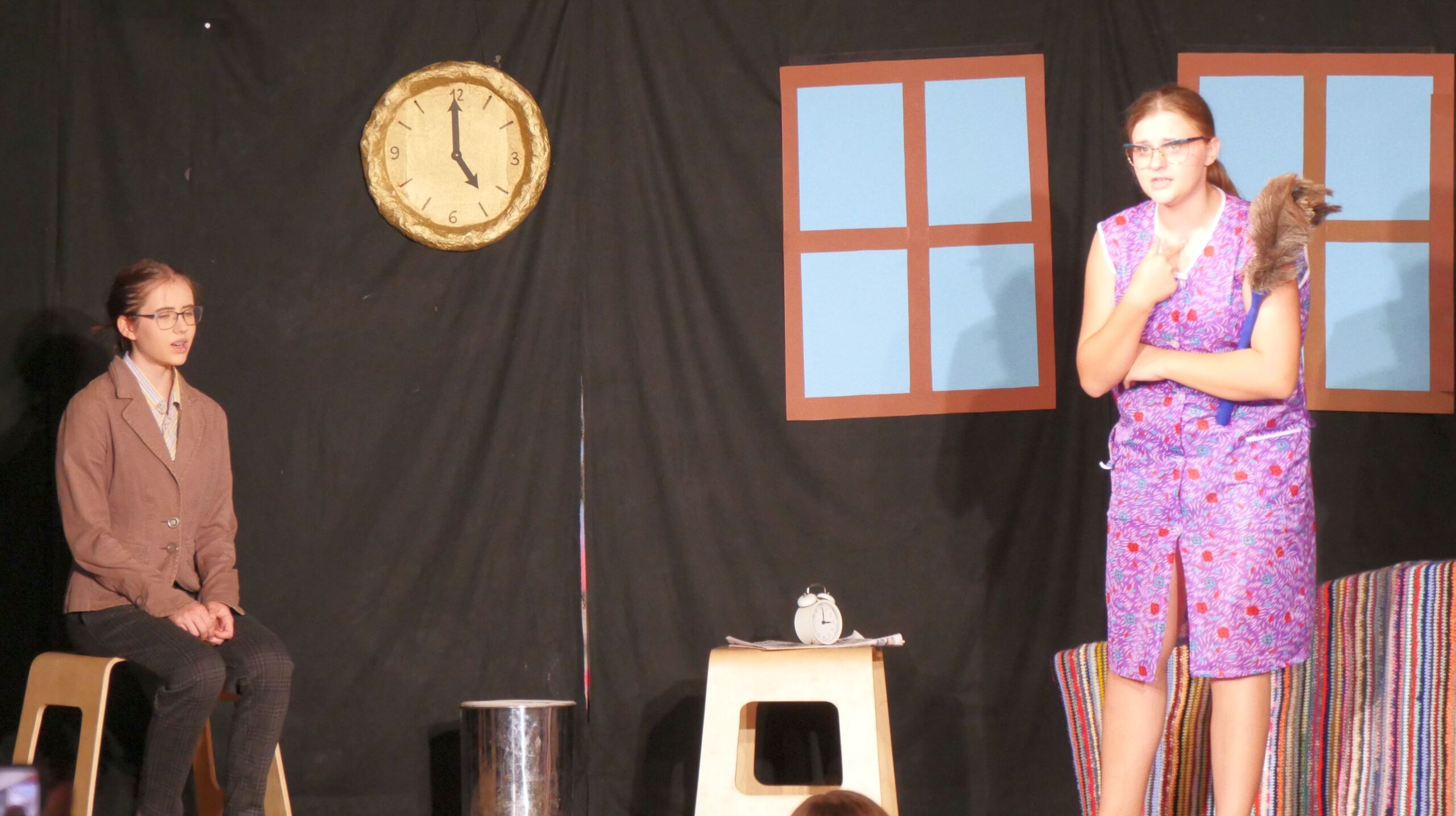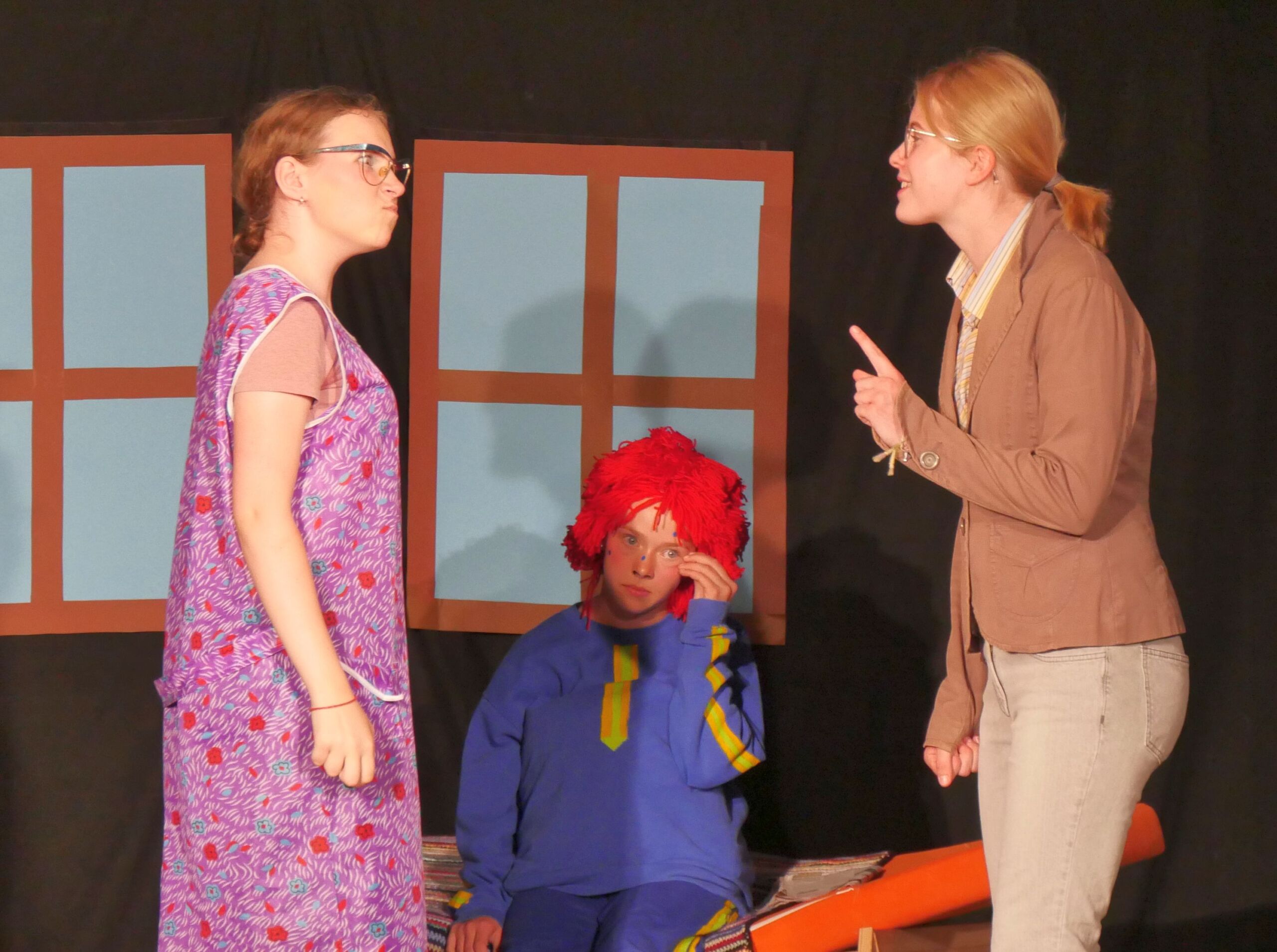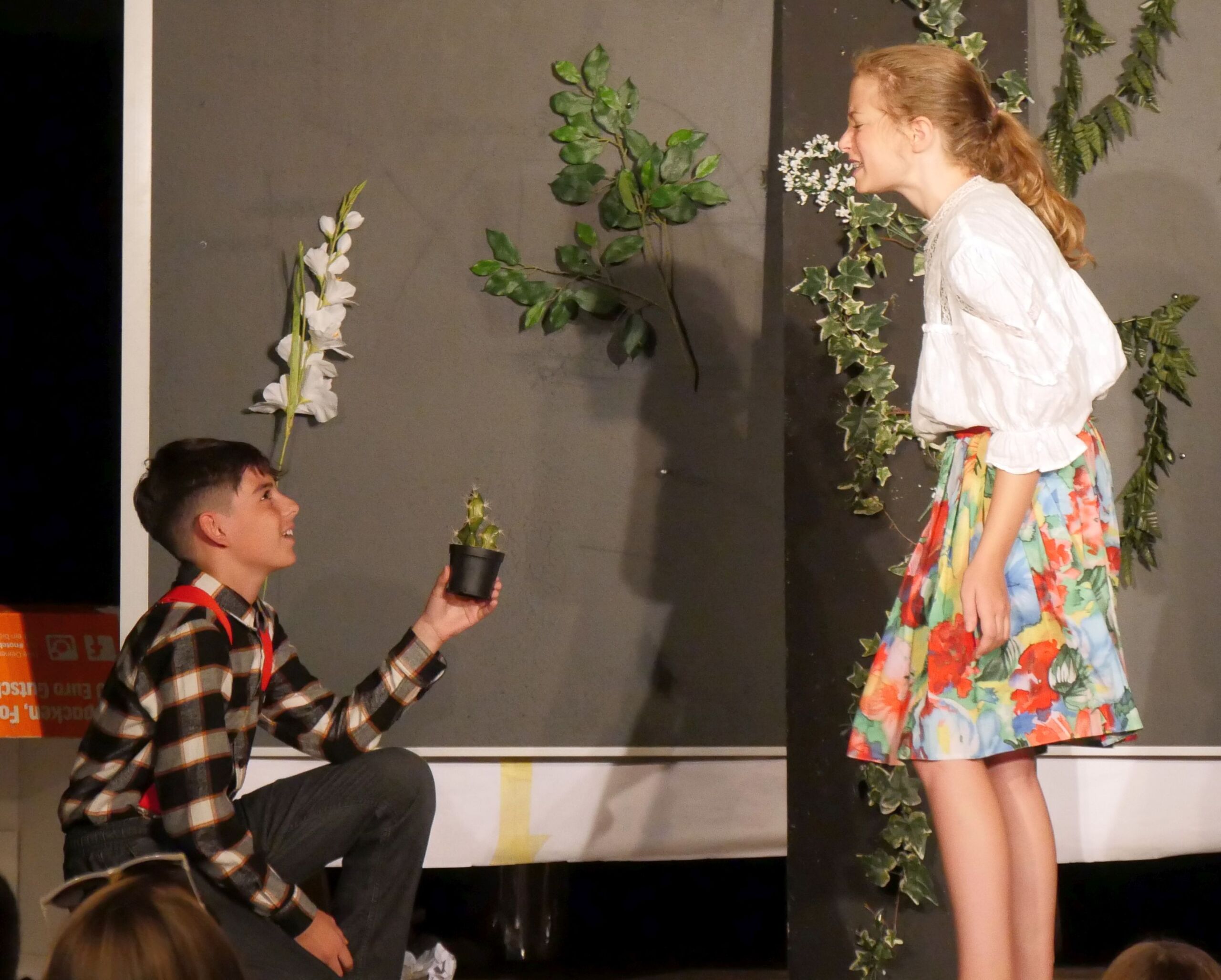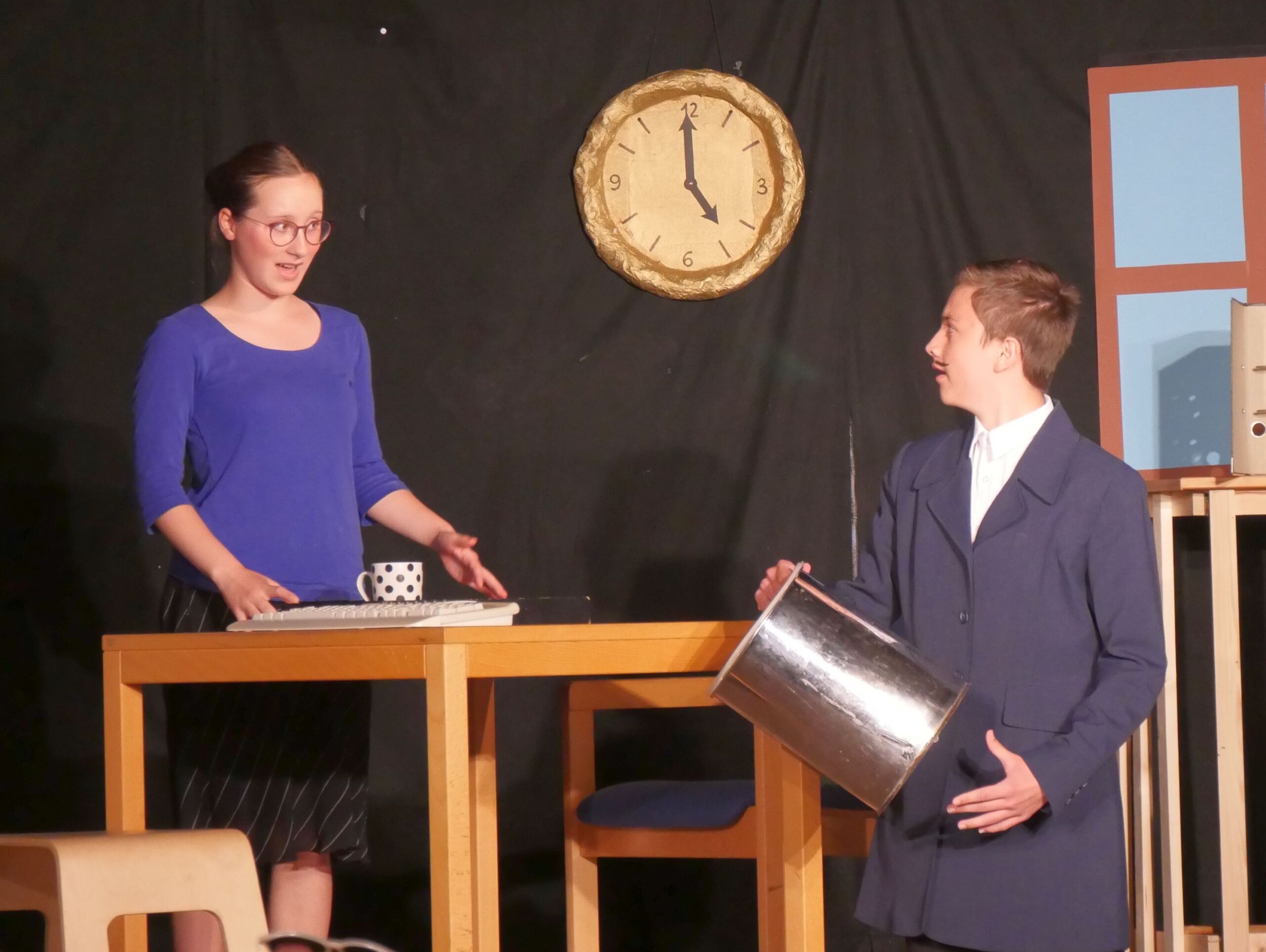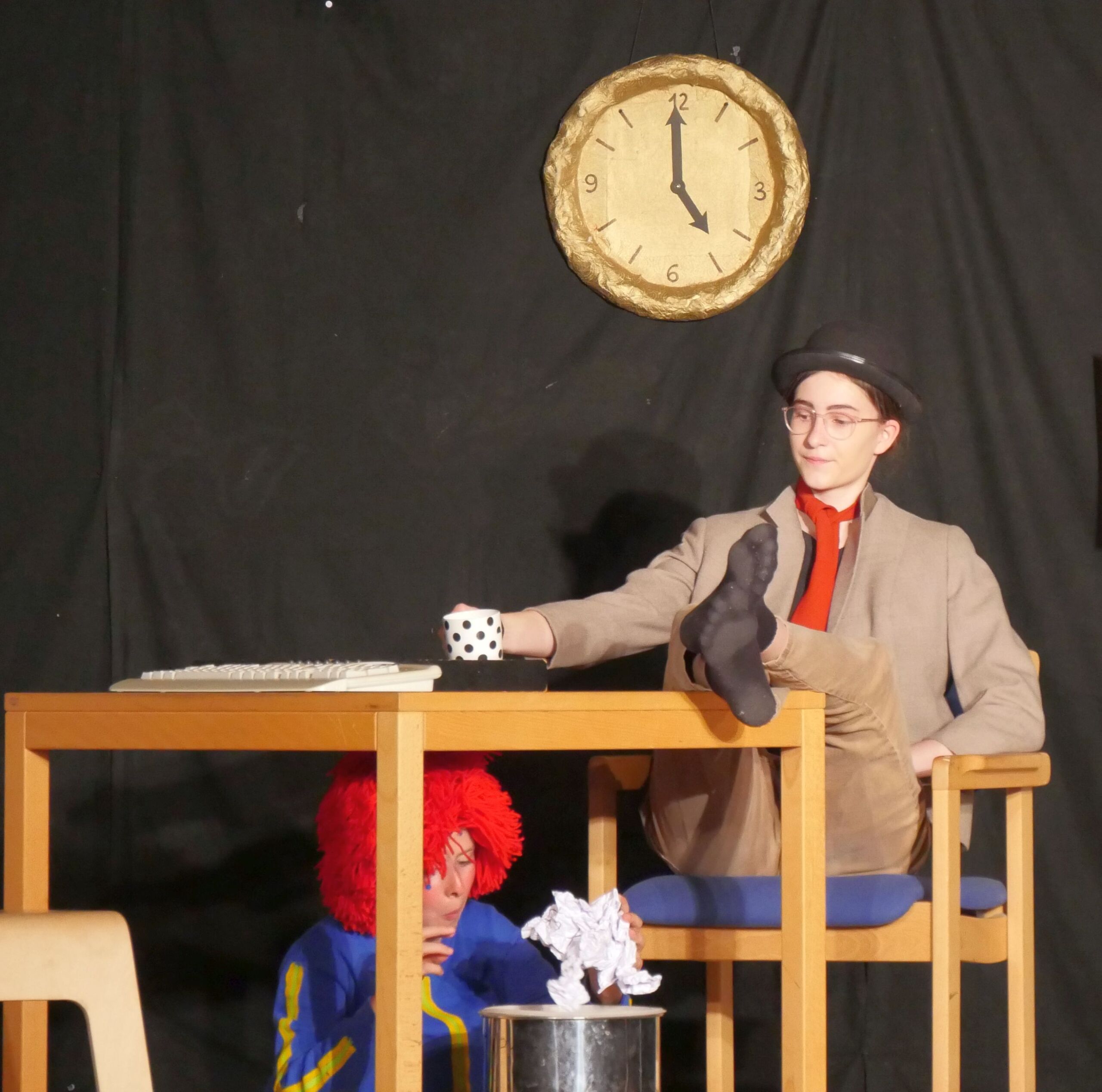 Geführt durch zwei souveräne Erzählerinnen, folgte nun ein schmissiger Ablauf der Szenen, unterstützt durch passende Musik und viel Situationskomik. Während die großen, tragenden Rollen hervorragend besetzt waren und die Schauspieler/innen in ihrer Darstellung absolut überzeugten, ernteten aber auch die kleineren Rollen viel Applaus. Der unsäglich verliebte Eduard, der seine angebetete Ottilie nicht erreichen konnte mit seinen verbalen Avancen, spielte sich in die Herzen der Zuschauer, ebenso wie der überforderte Studienrat Gröll, der dem Sams in seinem Unterricht begegnete und der schließlich, aufgrund eines vom Direktor festgestellten Burnouts, erstmal in den vorzeitigen Ruhestand geschickt wurde. Auch Herr Oberstein, Chef des Herrn Taschenbier, zeigte seine innere und äußere Verzweiflung hautnah und nachvollziehbar, sodass die Zuschauer das Gefühl bekamen, dass ein Sams, tritt es einmal in das Leben eines Menschen, dies vollkommen verändert.